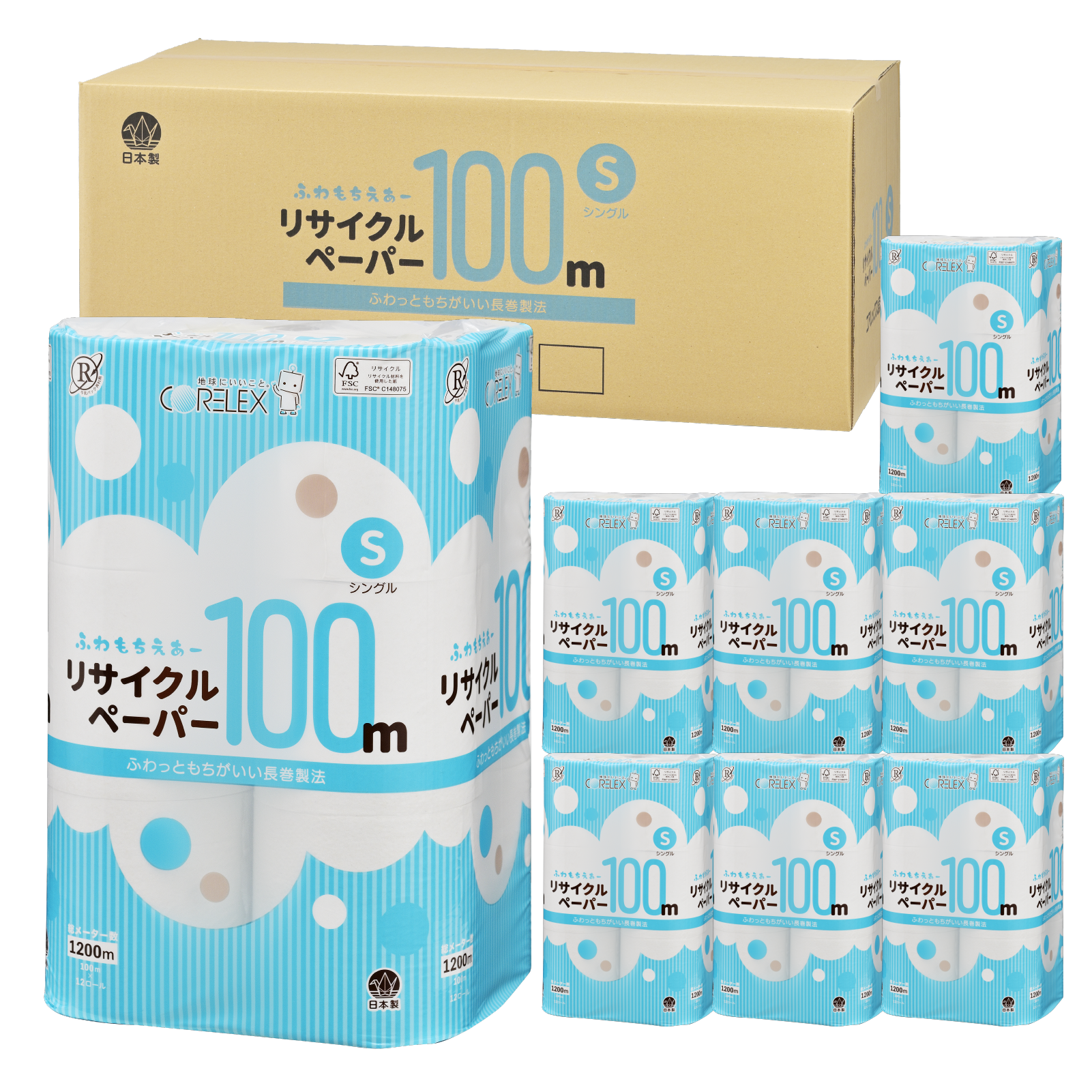 【ふんわり柔らか!】ふわもちえあーリサイクルペーパー長巻タイプ シングル 100m|12ロール|8パック(芯あり)